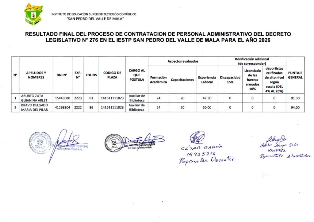 Resultado Final del Proceso de Contrato de Personal de Biblioteca