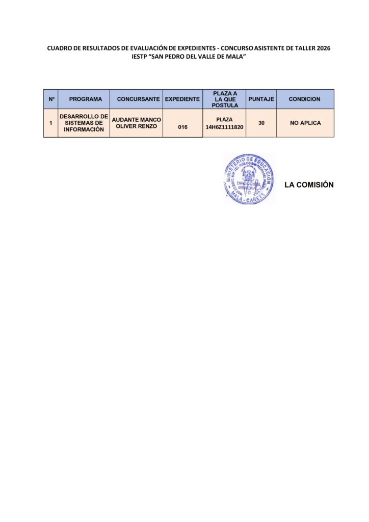 Publicación de Cuadro de Resultados de Evaluación de Expedientes Asistente de Taller 2026